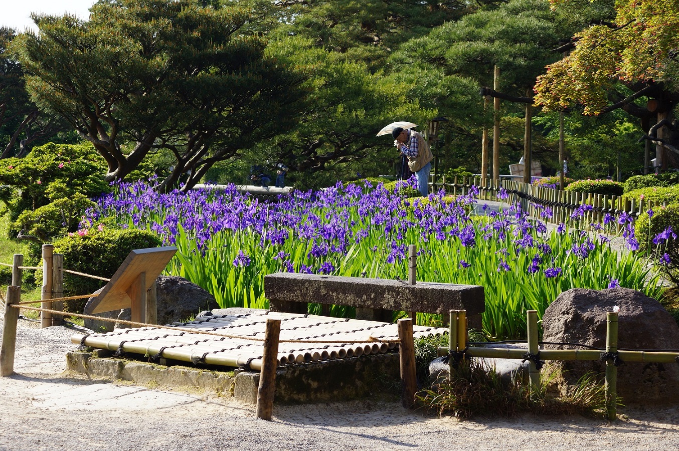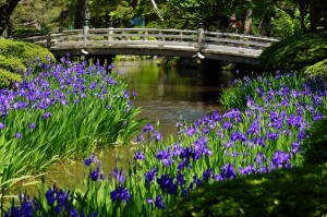 兼六園内曲水にかる橋の上流側または下流側のところどころで「カキツバタ」が群生して咲いています。 この写真は花見橋下流から花見橋を望む場所です。