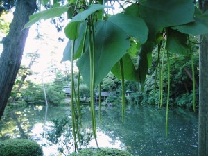 瓢池の淵で長さ30cmほどの「キササゲ」の実がぶら下がっています。色は緑色なのでまだ若いですかね。これから秋にかけて見られます。